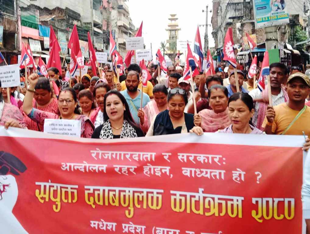 सरकार र रोगजारदातालाई दवाव दिन श्रमिकले पहिलो दिन सुरु गरेको आन्दोलनमा वीरगन्जको घण्टाघरबाट संयुक्त रुपमा निकालीएको ¥याली वीरगन्जको माईस्थान, आदर्शनग, अलखिया, घडिअर्वा चोक हुँदै पुनः घण्टाघरमा पुगेर कोणसभामा परिणत भएको छ । कोण सभामा प्रदेश कमिटीका तीन वटै संघठनहरु, समग्र उद्योग ट्रेड युनियन नेपाल, नेपाल कारखाना श्रमिक संघ र अखिल नेपाल औद्योगिक मजदुर संघका मदेश प्रदेशका अध्यक्ष क्रमशः हेमराज न्यौपाने, केदार पटेल र रामपुकार कामतीले सम्बोधन गरे । संयुक्त दवावमुलक ¥याली पश्चात मजदुर संगठनहरुले आन्दोलनको विभिन्न चरणको तालिका सार्वजनिक गरेका छन् । जस अन्तरगत साउन २१ गतेदेखि २६ गतेसम्म आ–आफ्नो टे«ड युनियन मार्फत उद्योगलाई तलब वृद्धि गर्ने माग सहितको दबाव पत्र दिने, दबाव पत्र प्रत्येक उद्योगले श्रम मन्त्रालय र प्रधानमन्त्रीको कार्यालयमा पठाउने तालिका पनि उनीहरुले सार्वजनिक गरेका छन् । त्यसै गरी साउन २७ गते प्रदेश स्तरीय परिचालन समितिको संयुक्त बैठक बस्ने, साउन २८ गतेखि ३२ गतेसम्म उद्योगमा नाराजुलुश, कोणसभा र कार्यालयमा धर्ना दिने कार्यक्रम रहेको छ । त्यसपछि भने भदौ १ गतेदेखि अनिश्चितकालिन अवज्ञा आन्दोलन गर्ने तालिका रहेको मजुर संगठनका अगुवाहरुले घोषणा पनि गरे ।