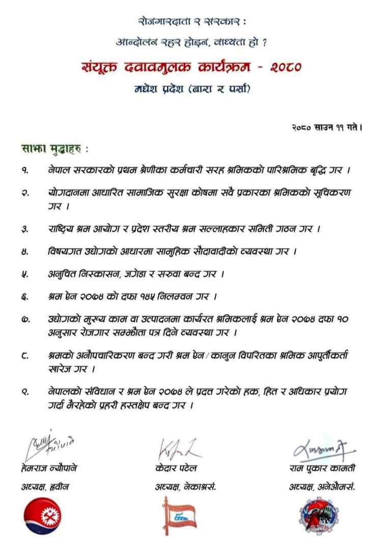 श्रमिकका नौ सुत्रीय मागहरुमा सरकारलाई प्रथम श्रेणीका कर्मचारी सरह श्रमिकको पारिश्रमिक बृद्धि गर्न पहिलो नम्बर बुँदामा नै उनीहरुले उल्लेख गरेका छन् । त्यसै गरी योगदानमा आधारित सामाजिक सुरक्षाकोषमा सबै प्रकारका श्रमिकको सूचिकरण गरिनु पर्ने, राष्ट्रिय श्रम आयोग र प्रदेशस्तरीय श्रम सल्लाहकार समिति गठन गरिनु पर्ने, बिषयगत उद्योगको आधारमा सामूहिक सौदावाजीको व्यवस्था गरिनुपर्ने, अनुचित निस्कासन जगेडा र सरुवा बन्द हुनुपर्ने र श्रम ऐन २०७४ को दफा १४५ निलम्बन गरिनु पर्ने उनीहरुको माग छ । त्यसरी नै उद्योगको मुख्य काम उत्पादनमा कार्यरत श्रमिकहरुलाई श्रम ऐन २०७४ को दफा १० अनुसार रोजगार सम्झौता पत्र दिने व्यवस्था गरिनुपर्ने, श्रमको अनौपचारिककरण बन्द गरी श्रम ऐन÷कानून विपरितका श्रमिक आपुर्तिकर्ता खारेज गर्नुपर्ने र नेपालको संविधान र श्रम ऐन २०७४ ले प्रदत्त गरेको हक हित र अधिकार प्रयोग गर्दा भइरहेको प्रहरी हस्तक्षेप बन्द गरिनुपर्ने उनीहरुले प्रष्ट माग राखेका छन् ।