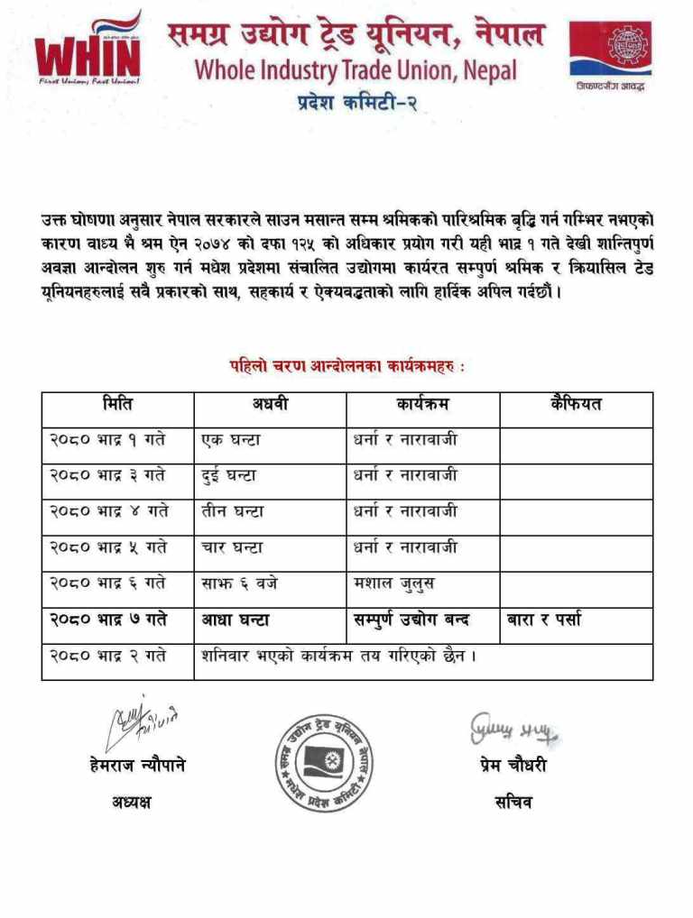 नेपाल सरकार र रोजगारदाताहरुले नेपालको संविधान र श्रम ऐनलाई समेत उपेक्षा गरेको भन्दै श्रमिक संगठन समग्र उद्योग ट्रेड यूनियन नेपाल (ह्विन) ले भदौ १ गतेदेखि लागु हुनेगरी एकहप्ते आन्दोलनको कार्यक्रम घोषणा गरेको छ । घोषित आन्दोलन अन्तर्गत आगामी भदौ सात गते पर्सा र बाराका सबै उद्योग बन्द गर्ने सम्मको कार्यक्रम रहेको पाइएको हो ।