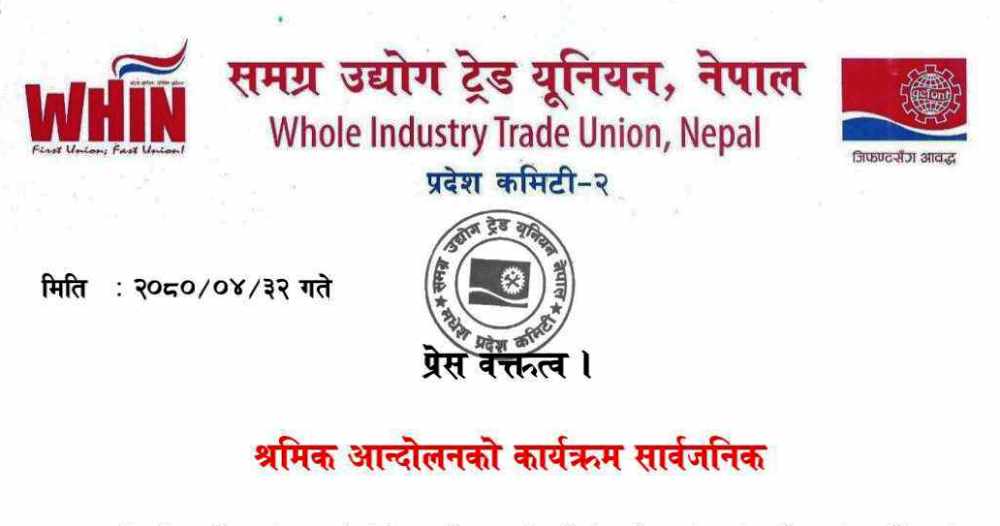 नेपाल सरकार र रोजगारदाताहरुले नेपालको संविधान र श्रम ऐनलाई समेत उपेक्षा गरेको भन्दै श्रमिक संगठन समग्र उद्योग ट्रेड यूनियन नेपाल (ह्विन) ले भदौ १ गतेदेखि लागु हुनेगरी एकहप्ते आन्दोलनको कार्यक्रम घोषणा गरेको छ । घोषित आन्दोलन अन्तर्गत आगामी भदौ सात गते पर्सा र बाराका सबै उद्योग बन्द गर्ने सम्मको कार्यक्रम रहेको पाइएको हो ।
