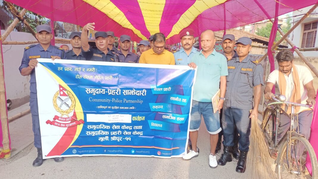 सामुदायिक प्रहरी साझेदारी कार्यक्रम अन्तर्गत सामुदायिक प्रहरी सेवा केन्द्र मुर्ली तथा सामुदायिक प्रहरी सेवा केन्द्र श्रीपुरको आयोजना र वडा प्रहरी कार्यालय श्रीपुरको सहयोग तथा श्री नवरात्रि महोत्सव दुर्गा पूजा सेवा समितिको सहकार्यमा सरसफाइ कार्यक्रम गरिएको छ ।
