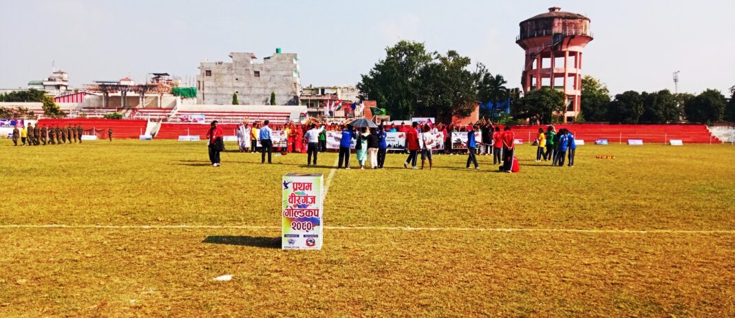 ‘प्रथम वीरगन्ज गोल्डकप २०८०’ शनिबार सुरुभई आगामी कार्तिक २५ गतेसम्म वीरगन्जको आदर्शनगर रंगशालामा चल्ने छ । यसको लागि नेपालको आर्मी क्लव, पुलिस क्लव सहित नेपाल र भारतका आठवटा टिम सहभागी हुने प्रतियोगिता आयोजक संस्था भेट्रान सिटी क्लव वीरगन्जका अध्यक्ष सबिन बस्नेतले बताए ।