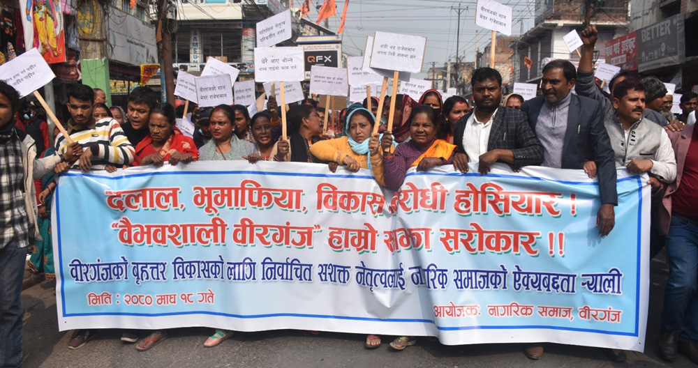 वीरगन्ज महानगरपालिकाले दुईवर्षमा नै राम्रा काम गरेको भन्दै त्यसको समर्थनमा नागरिक समाज वीरगन्जले साथ दिने जनाएको छ । बिहिबार जिल्ला प्रहरी कार्यालय, पर्सा अगाडीको रातो वंगलाबाट महानगरका राम्रा कामको समर्थन गरिने भन्दै प्रदर्शन सहित नागरिक समाज वीरगन्जले महानगरका दुईवर्षे कामको साथ दिएको हो ।