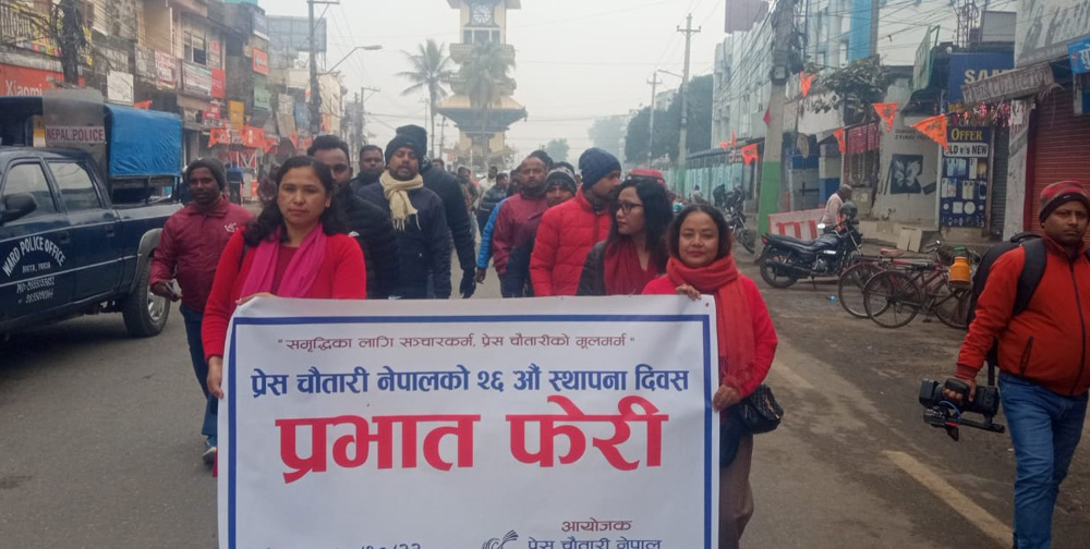 प्रेस चौतारी नेपाल पर्साका अध्यक्ष तुलसी भण्डारीको नेतृत्वमा निकालिएको प्रभात फेरी माईस्थान चोक, आदर्शनगर चोक हुँदै नगर परिक्रमा पश्चात पुनः घण्टाघर चोकमा पुगी कोण सभामा परिणत भएको छ । कोण सभालाई प्रेस चौतारी नेपाल मधेश प्रदेश सह–ईन्चार्ज श्याम बन्जाराले सम्बोधन गर्दै चौतारीको विगतको योगदानको चर्चा गर्दै आगामी दिनमा अझ सशक्त भएर समय सापेक्ष रुपमा चौतारीकर्मीहरुले लाग्नु पर्नेमा जोड दिए ।