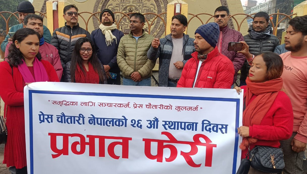 प्रेस चौतारी नेपाल पर्साका अध्यक्ष तुलसी भण्डारीको नेतृत्वमा निकालिएको प्रभात फेरी माईस्थान चोक, आदर्शनगर चोक हुँदै नगर परिक्रमा पश्चात पुनः घण्टाघर चोकमा पुगी कोण सभामा परिणत भएको छ । कोण सभालाई प्रेस चौतारी नेपाल मधेश प्रदेश सह–ईन्चार्ज श्याम बन्जाराले सम्बोधन गर्दै चौतारीको विगतको योगदानको चर्चा गर्दै आगामी दिनमा अझ सशक्त भएर समय सापेक्ष रुपमा चौतारीकर्मीहरुले लाग्नु पर्नेमा जोड दिए ।