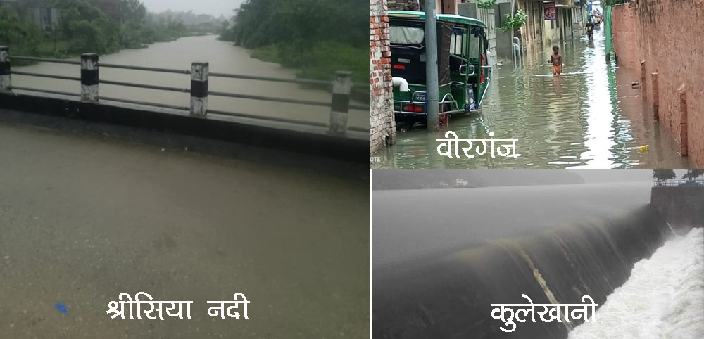 घनघोर वर्षाको कारण श्रीसिया नदीको जलसतह पार गरेको छ । नदिको सतह पार गरी त्यसको पानी नजिकको बस्तीमा पसेको छ ।