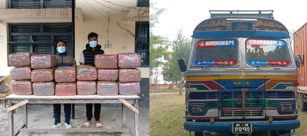 वीरगंज, १५ पुस । पर्सा प्रहरीले १६० किलो गाँजासहित दुईजनालाई पक्राउ गरेको छ । आइतवार राति ९ः३० बजेको समयमा जिल्ला पर्सा वीरगंज महानगरपालिका वडा नं. १८ भवानीपुर सिताराम चोकस्थित प्लाष्टिक कारखाना अगाडि सडकखण्डमा प्रहरी चौकी परवानीपुरले ड्राइपोर्ट आउँदै गरेको ना.३ ख ४२१२ नम्बरको ट्रक चेकजाँच गर्ने क्रममा १६० किलो गाँजा बरामद भएको जिप्रका, पर्साका प्रवक्ता प्रहरी नायब उपरीक्षक किशोर लम्सालले जानकारी गराएका छन् । ट्रकमाथि हुटमा फल्स बनाई रातो प्लाष्टिकमा बेरी लुकाइ छिपाई राखिएको १० के.जी.का दरले १६ पोकामा १६० किलो लागु औषध गाँजा बरामद भएको प्रवक्ता लम्सालले बताए । प्रहरीले ट्रकचालक एवं धनी जिल्ला मकवानपुर हेटौडा उमनपा वडा नं. ७ कमाने बस्ने ४४ वर्षीय कृष्ण घलान र चितवन जिल्ला झुरझुरे राप्ती न.पा. वडा नं. ३ बस्ने २० वर्षीय रोनाल विश्वकर्मालाई पक्राउ गरेको प्रवक्ता लम्सालले बताए । पक्राउ परेका दुवैजना व्यक्ति, लागूऔषध गाँजा र ट्रकलाई नियन्त्रणमा लिई आवश्यक अनुसन्धान गरिरहेको जिप्रका, पर्साले जनाएको छ ।