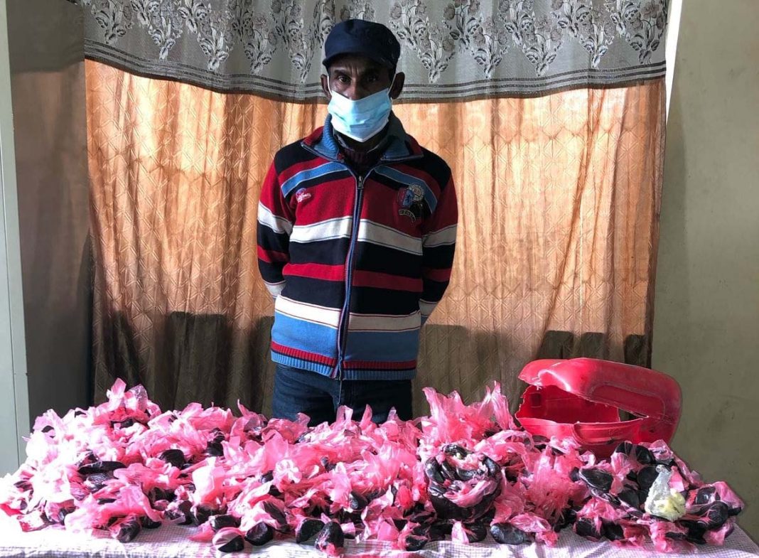 सर्लाही जिल्लाको विष्णु गाउँपालिका वडा नं. ४ मधुवन गोठ बस्ने वर्ष ४५ को सुधीर कर्णले बोकेको रातो रंगको डिब्बा (ग्यालेन)माथि खाने घ्यू राखी रातो प्लाष्टिकका ससाना पोकामा उक्त चरेस लुकाइ राखिएको अवस्थामा प्रहरीले नियन्त्रणमा लिएको जिल्ला प्रहरी कार्यालय, पर्साका प्रवक्ता प्रहरी नायब उपरीक्षक सुवास भट्टले जानकारी गराएका छन् ।