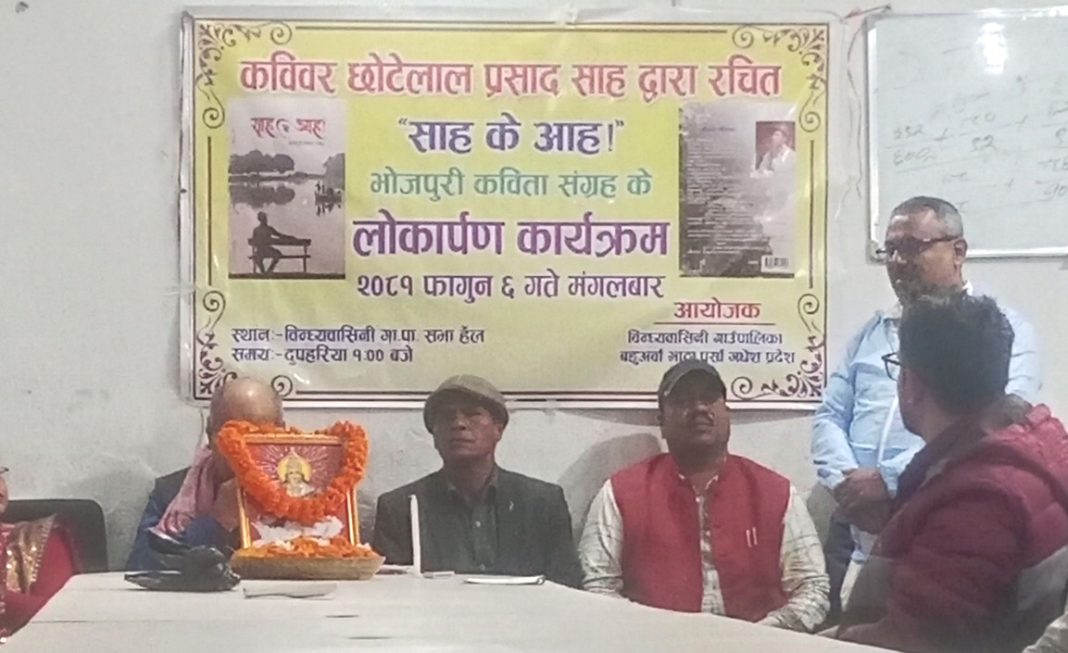 वीरगंज, ६ फागुन । कवि छोटेलाल प्रसाद साहद्वारा लिखित ‘साह के आह १’ भोजपुरी कविता संग्रहको मंगलवार विन्ध्यवासिनी गाउँपालिकाका अध्यक्ष प्रमोद तिवारीले लोकार्पण गरेका छन् । लोकार्पण कार्यक्रममा भाषा आयोगका सभासद साहित्यकार गोपाल अश्क, साहित्यकार तथा भोजपुरी प्रतिष्ठान वीरगंजका सल्लाहकार प्रमोद पाण्डे हेरम्ब, ध्रुवसिंह ठकुरी, अजमत अली लगायतले कवि साहले भोजपुरी साहित्य क्षेत्रमा पुस्तक लेखेर योगदान पु-याएकोमा प्रशंसा गरेका थिए । कार्यक्रममा स्वागत मन्तव्य गापा उपाध्यक्ष ज्योति चौरसिया र वडाध्यक्ष अच्छेलाल महतोले गरेका थिए ।