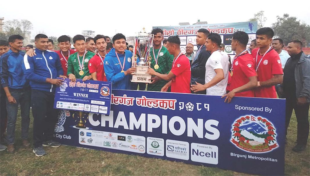 वीरगंज, २४ फागुन । नेपाल पुलिस क्लबले दोस्रो वीरगंज गोल्डकप फुटबल प्रतियोगिताको उपाधि हात पारेको छ । वीरगंज आदर्शनगर रंगशालामा सम्पन्न मधेश प्रदेशकै सर्वाधिक पुरस्कार राशीको यस गोल्डकपमा मछिन्द्र क्लबलाई ३–० गोल अन्तरले पराजित गर्दै पुलिस क्लबले उपाधि उचालेको हो ।