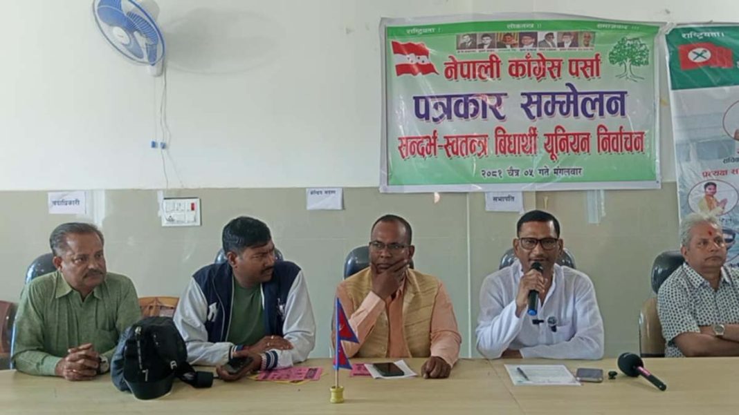 वीरगंज, ४ चैत । ठाकुर राम बहुमुखी क्याम्पसमा हुने स्वतन्त्र विद्यार्थी युनियन (स्ववियु) निर्वाचनमा सबै लोकतान्त्रिक शक्ति र विद्यार्थीहरूलाई एकजुट भई नेपाल विद्यार्थी संघ (नेविसंघ) लाई समर्थन गर्न नेपाली कांग्रेस जिल्ला कार्य समिति, पर्साले आग्रह गरेको छ । नेका पर्सा अध्यक्ष जर्नादन सिंह क्षेत्रीले आज पत्रकार सम्मेलनमा बोल्दै नेविसंघका उम्मेदवार विकास मण्डल धानुकको नेतृत्वमा निर्वाचनमा जित सुनिश्चित हुने बताए । उनले तराई–मधेस क्षेत्रको सबैभन्दा पुरानो क्याम्पस ठाकुर राम बहुमुखी क्याम्पसमा नेविसंघको विगतको विजयको इतिहासलाई स्मरण गर्दै विद्यार्थीहरूको संगठनप्रतिको स्नेह र वैचारिक आस्थाले यसपटक पनि जित सुनिश्चित हुने बताए । पत्रकार सम्मेलनमा जारी गरिएको विज्ञप्तिमा कृष्णप्रसाद भट्टराईले २०२७ सालमा स्थापना गरेको नेविसंघले नेपालको लोकतान्त्रिक आन्दोलनमा खेलेको अग्रणी भूमिका खेलेको बताए । विज्ञप्तिमा आन्तरिक प्रतिस्पर्धा र नेविसंघभित्रका केही स्वतन्त्र उम्मेदवारहरूको उपस्थितिलाई स्वीकार गर्दै समितिले संगठनको जितलाई प्राथमिकता दिन सबै सदस्यहरूलाई आग्रह गरेको छ। “कलम मसाल” झण्डालाई उच्च राख्न एकताको महत्वलाई जोड दिँदै सबै जिम्मेवार सदस्यहरूले यस कार्यमा योगदान गर्ने विश्वास नेपाली कांग्रेस पर्साले लिएको छ। विज्ञप्तिमा विद्यार्थीहरूको शैक्षिक र वर्गीय हितहरूको संरक्षण र संवद्र्धन गर्दै संघीय लोकतान्त्रिक गणतन्त्रलाई थप उन्नत बनाउने अभियानमा “राष्ट्रियता, लोकतन्त्र, समाजवाद र विद्यार्थी एकता” को आदर्श बोकेको नेविसंघलाई विजयी बनाउन सबै लोकतन्त्रवादी दाजुभाइ, दिदीबहिनी र विद्यार्थीहरूलाई नेपाली कांग्रेस पर्साले हार्दिक अपिल गरेको छ। ठाकुर राम बहुमुखी क्याम्पसमा हुन लागेको स्ववियु निर्वाचन संघीय लोकतान्त्रिक गणतन्त्रको स्थापनापछि पर्सामा पहिलो पटक हुन लागेकोले यसलाई महत्वपूर्ण घटनाको रूपमा हेरिएको छ।उक्त पत्रकार सम्मेलनमा जिल्ला अध्यक्ष एवं मन्त्री जर्नादन सिंह क्षेत्री,नेपाली कांग्रेसका नेता प्रकाश उपाध्याय लगाएतका नेपाली कांग्रेस जिल्ला कार्य समिति सदस्य एवं नेविसंघका नेता तथा उम्मेदवारहरूको उपस्थिति रहेको थियो ।
