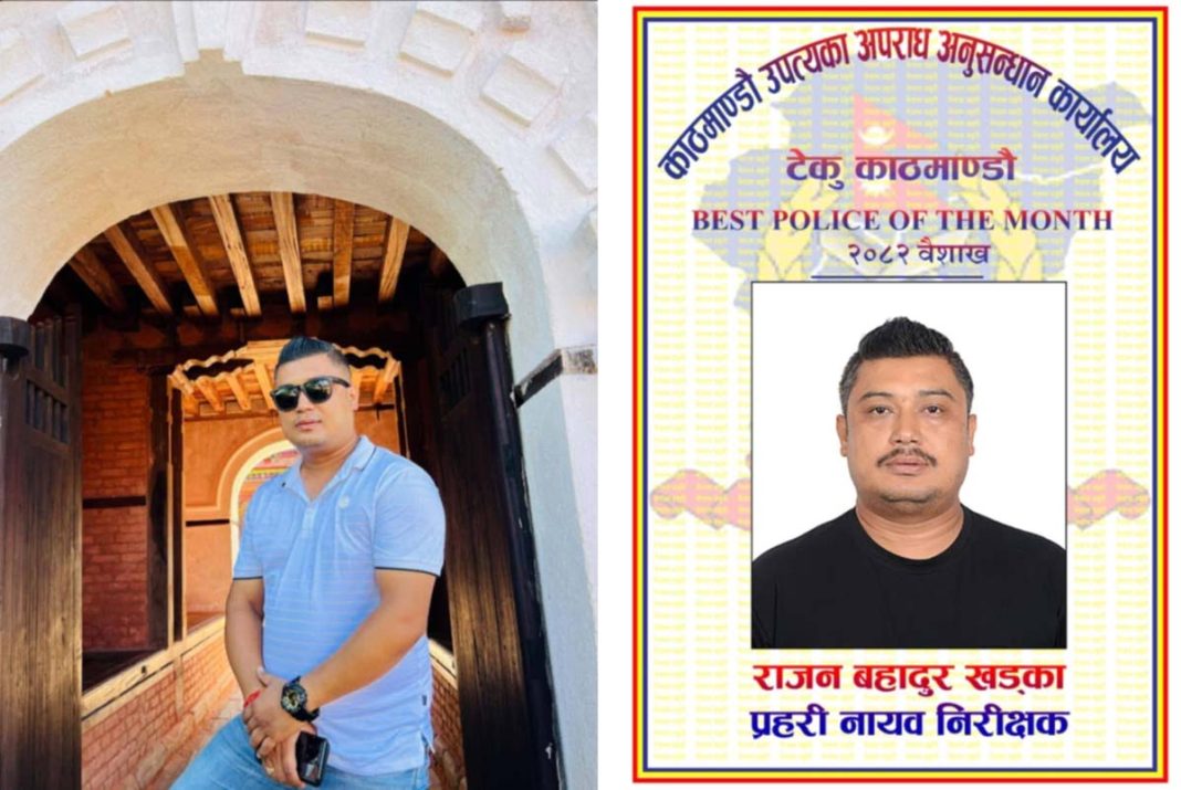 काठमाडौं, १ जेठ । उपत्यका अपराध अनुसन्धान कार्यालय टेकु काठमाडौंमा कार्यरत प्रहरी नायब निरीक्षक राजन बहादुर खड्का उत्कृष्ट प्रहरी घोषित भएका छन् । कार्यालयले आफू मातहत कार्यरत प्रहरी कर्मचारीको कार्य सम्पादनको आधारमा खड्कालाई सर्वाेत्कृष्ट प्रहरी घोषणा गरेको हो । ६ नम्बर पिल्लरमा कार्यरत खड्काले वैशाख महिनामा विभिन्न घटनाको अनुसन्धान तथा अन्य महŒवपूर्ण कार्यहरूमा उत्कृष्ट योगदान दिएपछि उनलाई उत्कृष्ट प्रहरी घोषित गरिएको हो । प्रहरी नायब निरीक्षक खड्काले साङ्गठनिक नीति निर्देशन बमोजिम दिइएको जिम्मेवारी एवं पदीय दायित्व इमान्दारी, वफादारी लगनशील तथा व्यावसायिकताका साथ कर्तव्यनिष्ठ भई उत्कृष्ट कार्य सम्पादन गरेको हुँदा खड्कालाई ‘बेस्ट पुलिस अफ द मन्थ’ घोषित गरिएको कार्यालयले जनाएको छ। खड्कालाई महिनाको ‘उत्कृष्ट प्रहरी छनोट कार्यविधि–२०८२’ अनुसार वैशाख महिनाको उत्कृष्ट प्रहरी घोषित गरिएको कार्यालय प्रमुख एवम् प्रहरी बरिष्ठ उपरीक्षक (एसएसपी) रमेश बस्नेतले जानकारी दिएका छन् ।