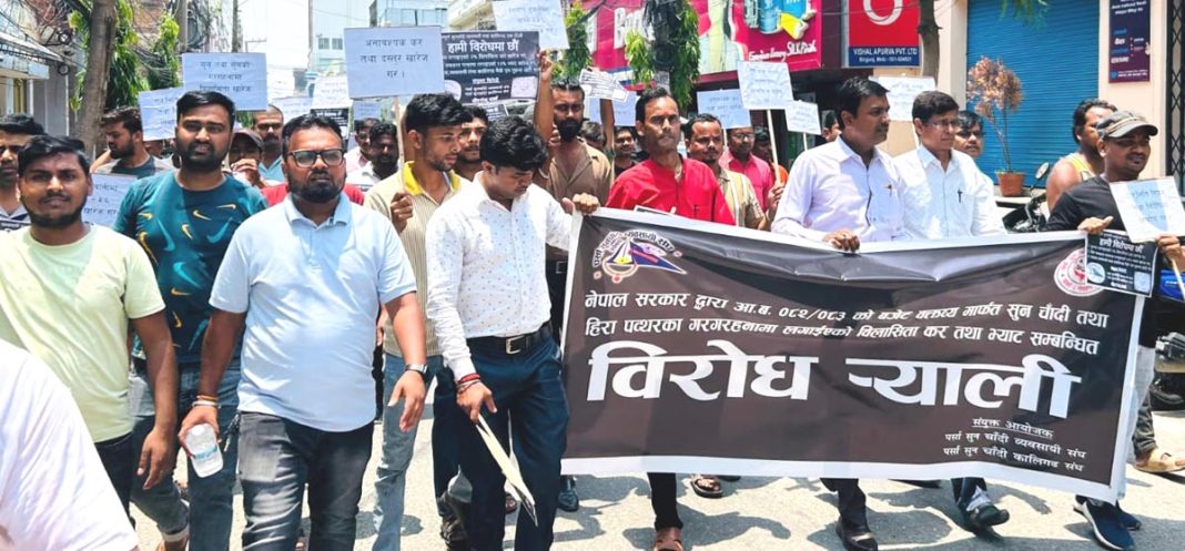 वीरगंज २५ जेठ । पर्साका सुनचाँदी व्यवसायीहरूले सरकारले चालू आर्थिक वर्षदेखि सुनचाँदीका गरगहनामा नयाँ मूल्य अभिवृद्धि कर (भ्याट) लागू गरेपछि प्रदर्शन गरेका छन् ।