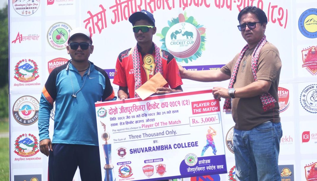 बारा, २५ जेठ । दोस्रो जीतपुरसिमरा क्रिकेट कप प्रतियोगिता अन्तर्गत आइतवार भएको खेलमा बारा बिजयी भएको छ । प्रतियोगिता अन्तर्गतको दोस्रो खेलमा बाराले मकवानपुरलाई सात विकेटले पराजित गरेको हो । सिमरास्थित सेज क्रिकेट खेल मैदानमा टस जितेर ब्याटिङ राजेको मकवानपुरले निर्धारित २० ओभरमा ९ विकेट गुमाउँदै एक सय ५० रन बनाएको थियो । मकवानपुरका लागि युविन बुढाथोकीले सर्वाधिक ४६ रन बनाए । अर्धशतका लागि चार रनले चुकेका युविन सिराज हवारीले पेभेलियन फर्काएका थिए । मकवानपुरका बिशाल फुयाँलले ३१, शुभ कंसकारले २४, रमेश लुईंटेलले १८ र कप्तान रामनरेश गिरीले ११ रन बनाए । अन्य ब्याटर चल्न सकेनन् । बलिङतर्फ बाराका सिराज हवारीले चार विकेट लिए । चार ओभरमा ३१ रन खर्चिदै सिराजले मकवानपुरको महŒवपूर्ण चार विकेट लिए । यसबाहेक आशिक बैठाले तीन र कप्तान अरनिको यादवले एक विकेट लिए । मकवानपुरले दिएको एक सय ५१ रनको लक्ष्य पछ्याउन मैदानमा उत्रिएको बाराले १८.१ ओभरमा तीन विकेट गुमाउँदै जित हात पारेको थियो । बाराको जितमा त्रितराज दासले ५१ रन प्रहार गर्दै अर्धशतक प्रहार गरे । यसैगरी रोहन साहले ३१, आदिल अंसारीले अविजित २२ र अरनिको यादवले २१ रन बनाए । बाराको जितमा चार विकेट लिएर सिराज प्लेयर अफ दि म्याच घोषित भए । सेराजलाई जीतपुरसिमरा उपमहानगरपालिकाका प्रवक्ता भोजबहादुर खत्री (ईश्वर) ले पुरस्कृत गरेका थिए । प्रतियोगिता अन्तर्गत सोमवार जीतपुरसिमरा क्रिकेट क्लब र युनाईटेड क्रिकेट क्लब वीरगंजबीच खेल हुनेछ । जीतपुरसिमरा स्पोर्ट्स क्लबको आयोजनामा शनिवारदेखि शुरू भएको प्रतियोगितामा ६ वटा टिमको सहभागीता रहेको छ । जेठ ३१ गतेसम्म आयोजना हुने प्रतियोगिताको विजेताले एक लाख र उपविजेताले ५० हजार नगद प्राप्त गर्नेछन् । प्रतियोगिताको उत्कृष्ट ब्याटर र बलरलाई समेत पुरस्कृत गरिनेछ । यसअघि शनिवार भएको उद्घाटन खेलमा गरूडा नगरपालिका रौतहटले आयोजकलाई १४ रनले पराजित गरेको थियो । जीतपुरसिमरा उपमहानगरपालिकाको मुख्य सहयोगमा आयोजित प्रतियोगितालाई मधेश प्रदेश क्रिकेट संघ र बारा जिल्ला क्रिकेट संघले प्राविधिक सहयोग गरिरहेको छ ।