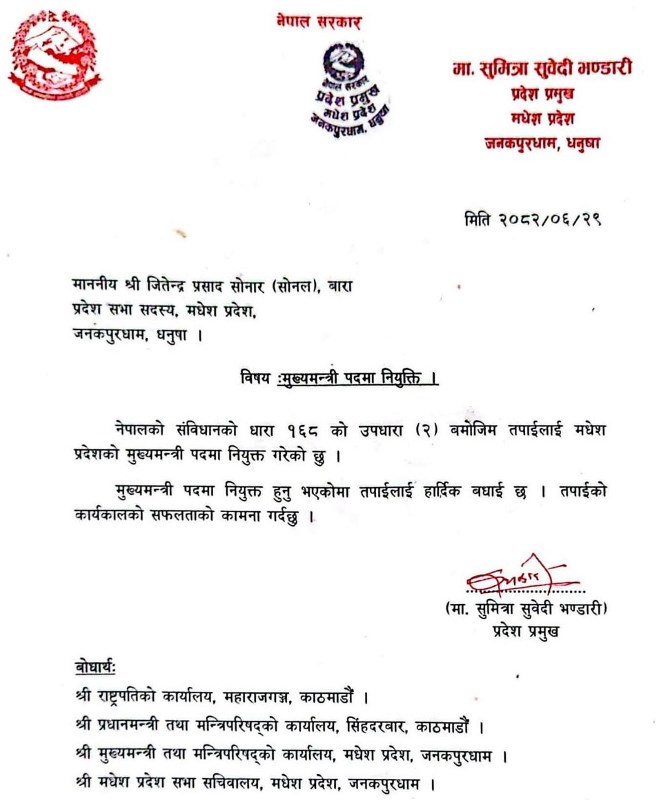 ‘मधेश प्रदेश सभा सदस्य सोनललाई नेपालको संविधानको धारा १६८ को उपधारा (२) बमोजिम मधेश प्रदेशको मुख्य मन्त्री पदमा नियुक्ति गरेको छु’ प्रदेश प्रमुख भण्डारीले मुख्यमन्त्रीमा नियुक्त सोनललाई दिएको पत्रमा उल्लेख गरिएको छ । अस्थिर राजनीतिको तानाबाना केन्द्रमा मात्र नभई मधेश प्रदेशमा पनि चलिरहेको छ ।