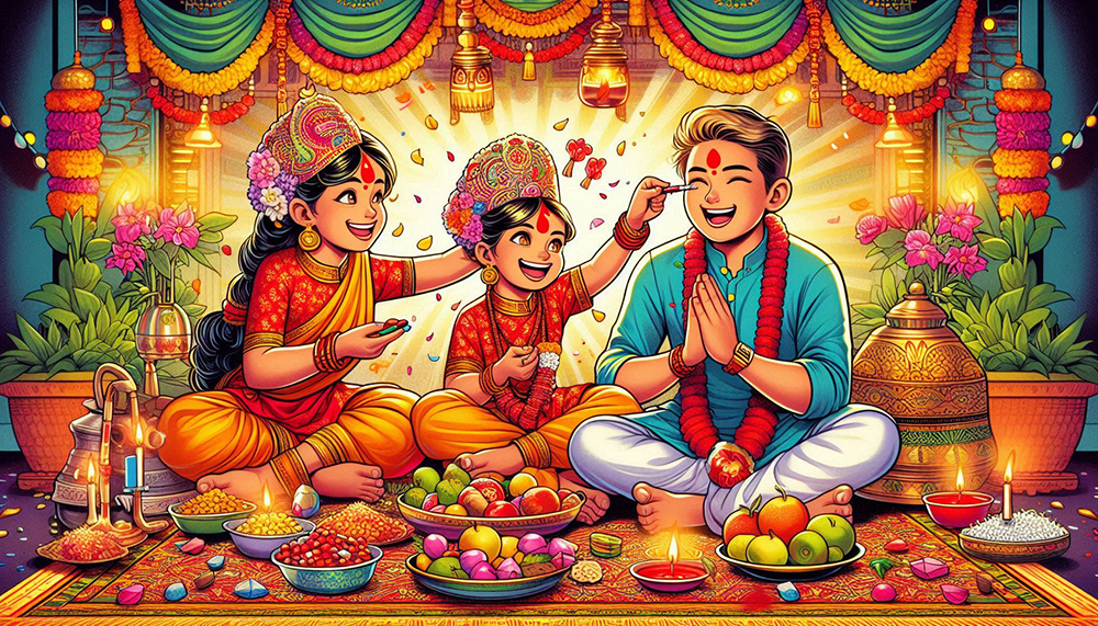 आज लक्ष्मी पूजाका दिन स्थापना गरिएको दियो, कलश र गणेशको पूजा गरी मूल थालीमा लेखिएको अष्टदलमा मार्कण्डेय, अश्वत्थामा, बलि, व्यास, हनुमान, विभीषण, कृपाचार्य र परशुराम गरी अष्ट चिरञ्जीवी, चित्रगुप्त, यमराज, यमुना र धर्मराज, गणपत्यादि वनस्पत्यन्त देवताको समेत पूजा आराधना गरी दिदीबहिनीले दाजुभाइलाई तेलको धाराले छेकेर परम्परा अनुसार सप्तरङ्गी वा पञ्चरङ्गी टीका, मखमली, सयपत्री वा गोदावरी लगायतका फूलका माला लगाइदिएका छन् ।