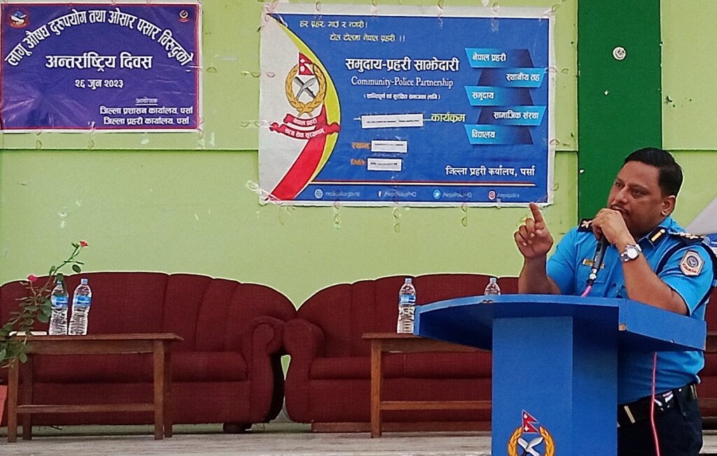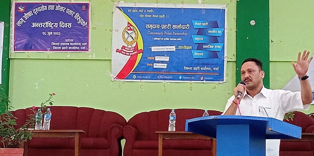 जिल्ला प्रशासन कार्यालय पर्साकै अगुवाईमा यहाँको सशस्त्र प्रहरी नेपाल प्रहरीको समेत सकृय सहभागीतामा सोमबार दिवसकै दिन बिहान जनचेतनामुलक ¥याली, दिउसो पर्साका सबै पालिकाका वडाध्यक्ष र समाजका अगुवाहरुसँग अन्तरकृया र साँझमा दिप प्रज्वलित गरी अन्तर्राष्ट्रिय लागु औषध दुरुपयोग तथा ओसारपसार विरुद्धको दिवस मनाइएको छ । दिवसको क्रममा सीमावर्ती शहर वीरगन्जमा गरिएको अन्तरकृयामा सार्वजनिक तथ्याँक अनुसार पर्सामा हरेक बर्ष लागु औषध प्रयोगकर्ता र ओसार–पसार गर्नेको संख्या बढेको पाइएको हो ।